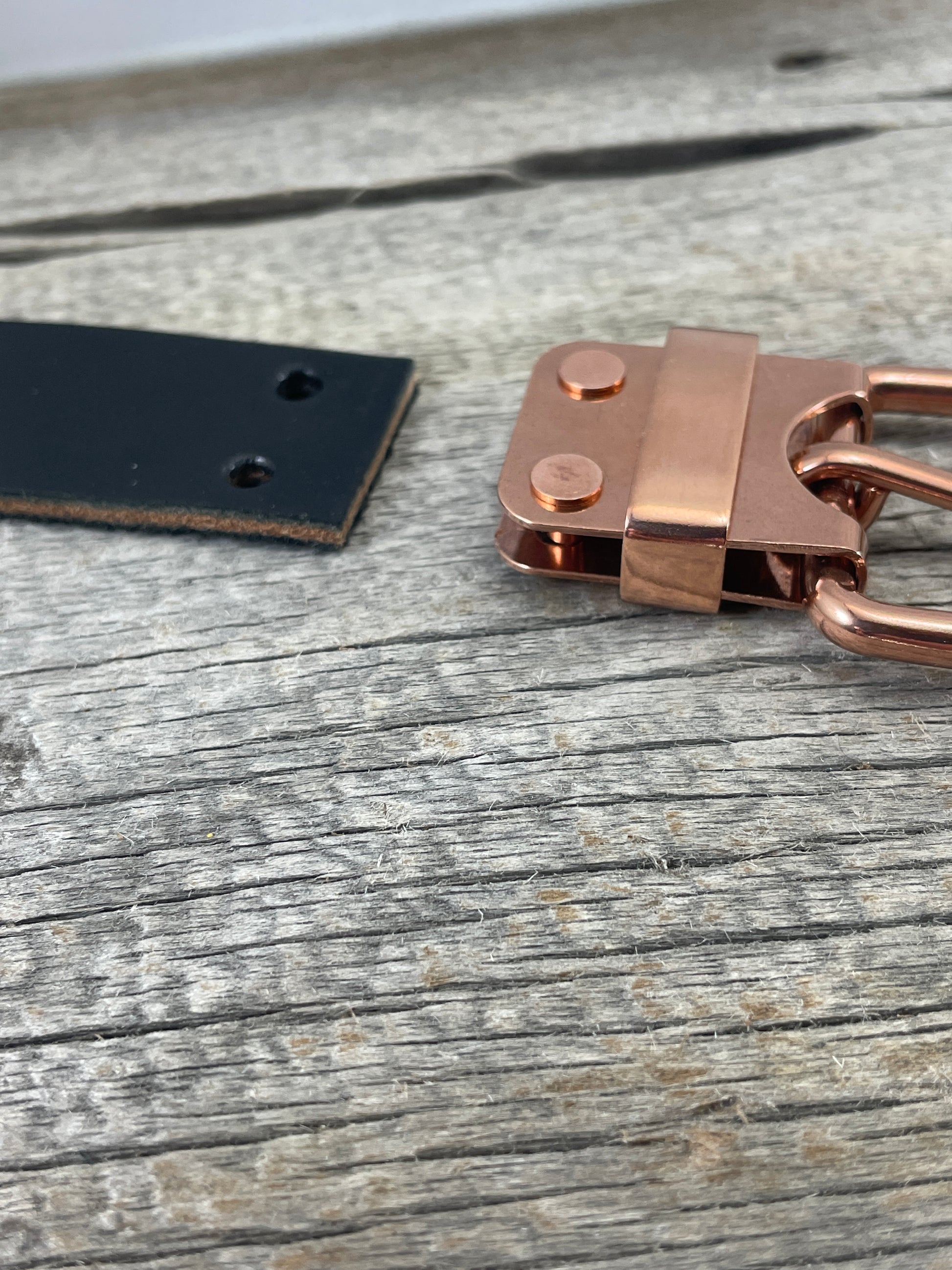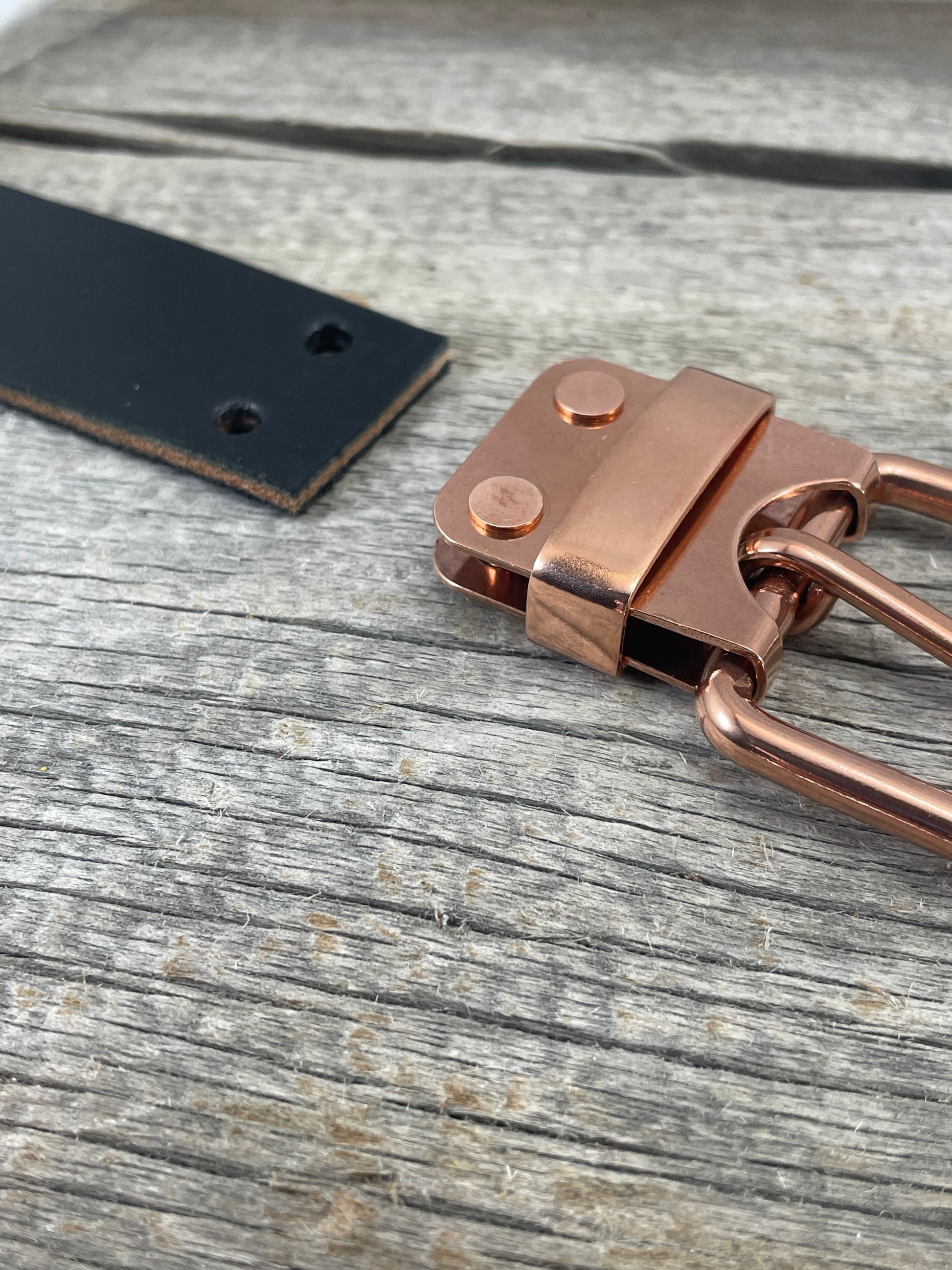 This buckle is designed to fit leather or leather-like straps from 5 oz to 15 oz in thickness. US-made Chicago screws make it easy to swap buckles or new leather straps as needed