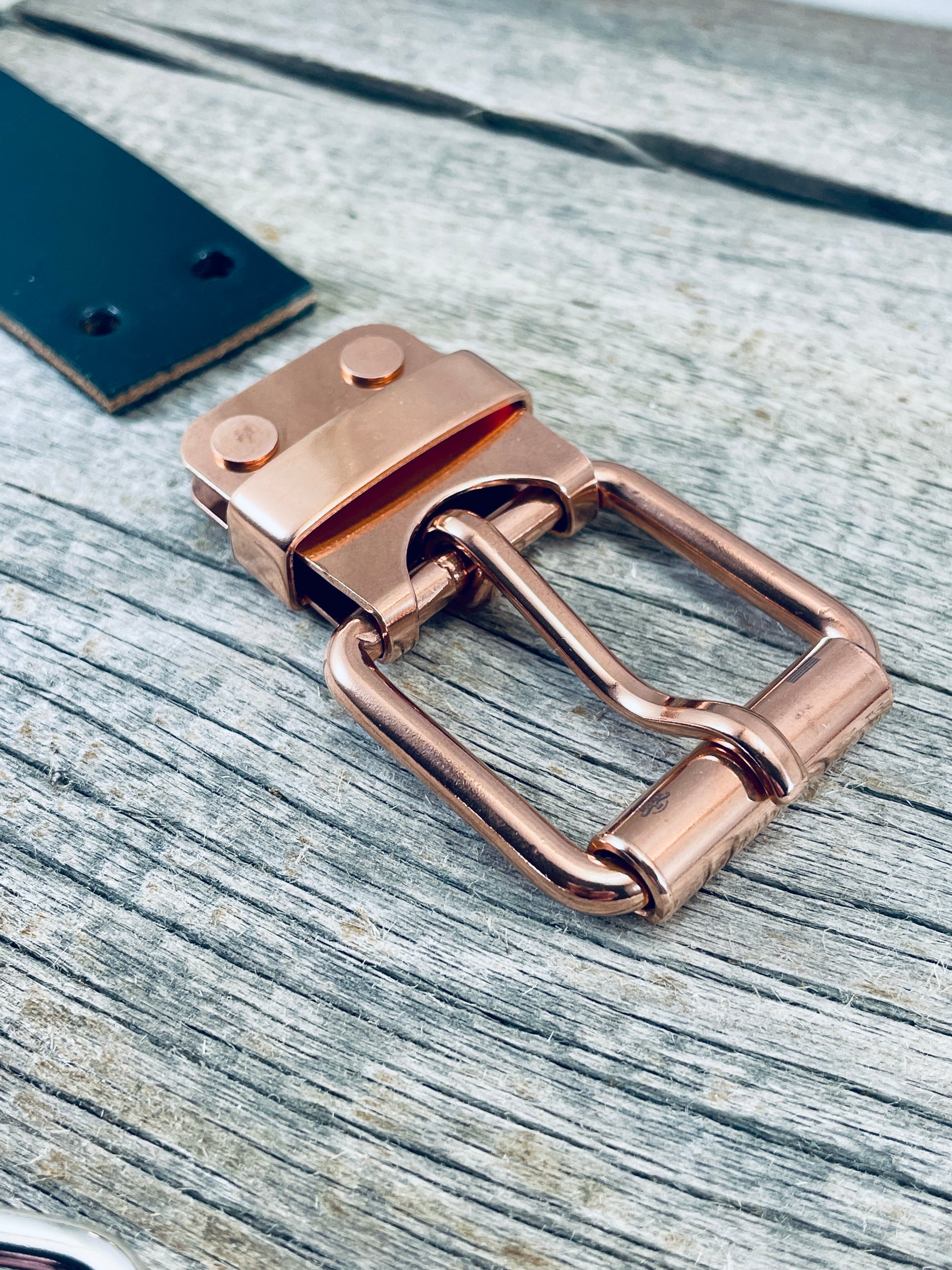 The solid copper roller buckle mounts to a copper belt-plate and copper keeper, fastened with Chicago screws (included). No stitching. No failure points. The result is a lower profile with increased comfort and flexibility. Its hinge function allows the buckle to move with the body, making it the most comfortable belt you'll ever wear.